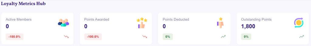 At the start of your dashboard, the Loyalty Metrics Hub provides a bird’s-eye view of your program’s core health indicators. This section features four key metric cards, each designed to give you instant insight into different aspects of your loyalty ecosystem.