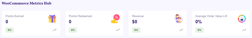 Since WooCommerce includes its own Metrics Hub, the Points Earned and Points Redeemed metrics are available to all users, while the Revenue-related cards are accessible only to Pro license holders.