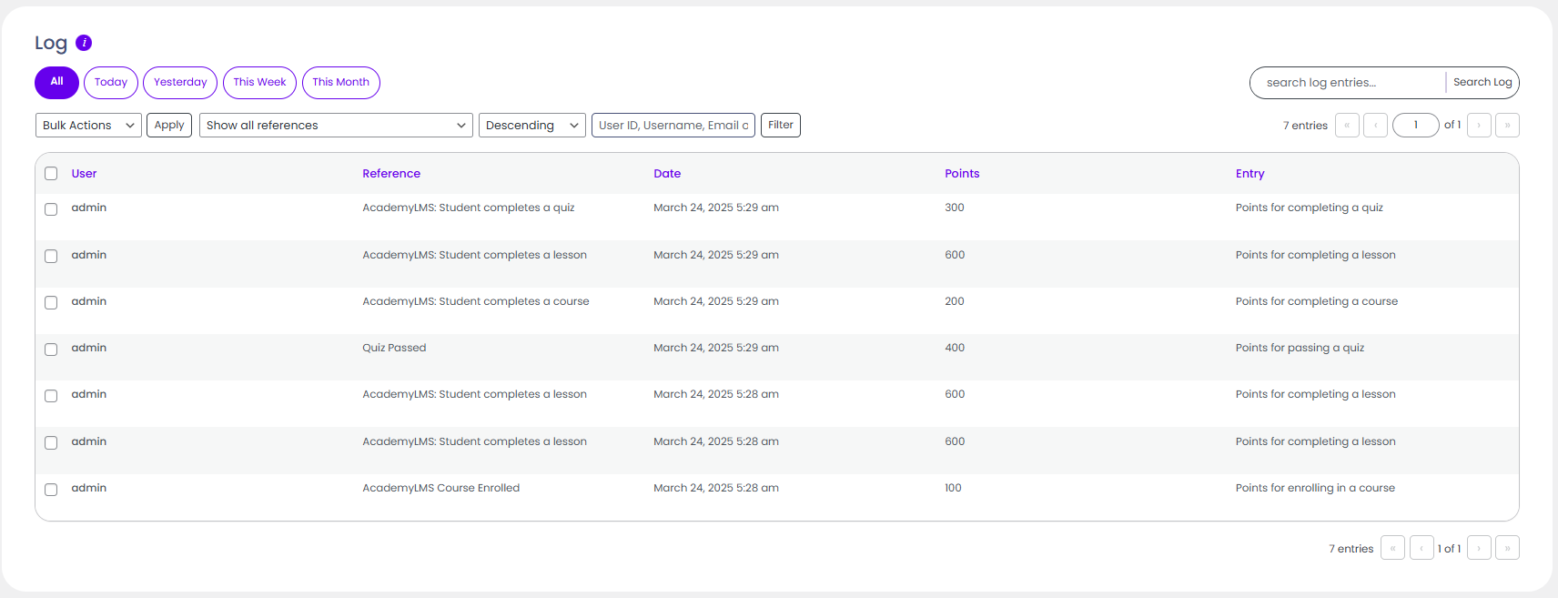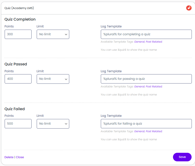 myCred Academy LMS addon awarding points for course, lesson, and quiz completion.